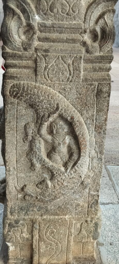 During his youthful wanderings, Anjaneya entered this lake to bathe. The makara attacked and dragged him underwater. Realising the creature’s supernatural nature, Anjaneya expanded his form, subdued it, and tore it apart. The liberated gandharva blessed him and foretold that his unmatched strength would one day be dedicated to the service of Sri Rama.